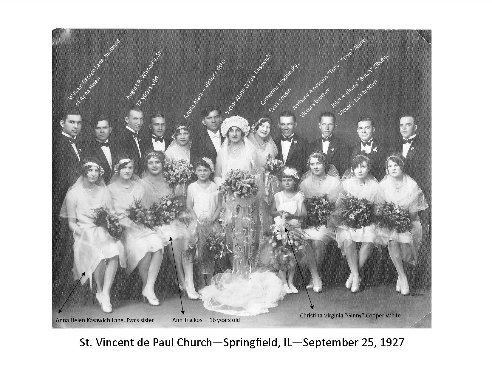 The date was Sept. 25-27, 1927. The location was the E. Reynolds St. home of just-deceased Lithuanian-born coal miner Paul Kasawich (1872-1926) and his Lithuanian-born widow Anna Leschinsky (1877-1967), mother of bride Eva Kasawich (Vic and Dick’s) mother. Vic and Dick’s father, the groom, was Victor Alane, Sr., son of Lithuanian-born coal miner Joseph Alane, 1876-1907 (who had died in the Pennsylvania coal fields at age 31) and Petronele Spendzninas (1876-1938).