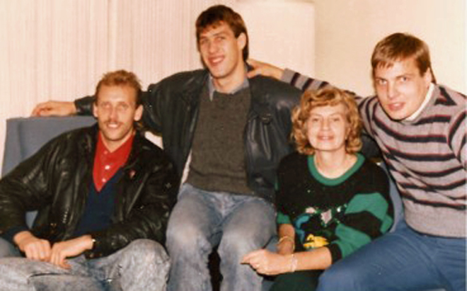 Fall 1988, Lawrence, KS, fr. left – Arvydas Sabonis, Rimas Kurtinaitis, Sarunas Marciulionis, Vita Zemaitis.