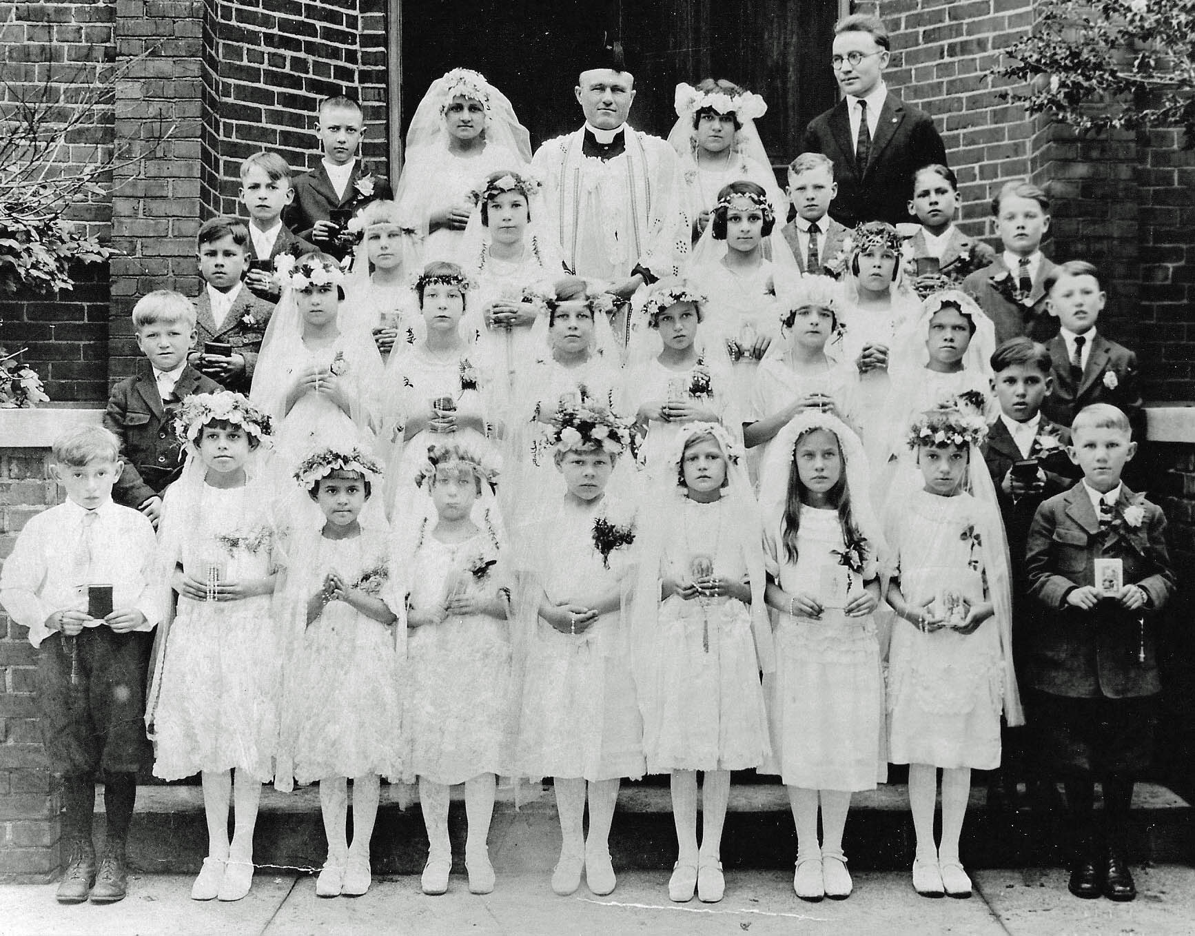 First Communion at St. Vincent de Paul’s in Springfield circa 1922. Helen Banzin is second from left in the front row and her sister Margaret is third from left.