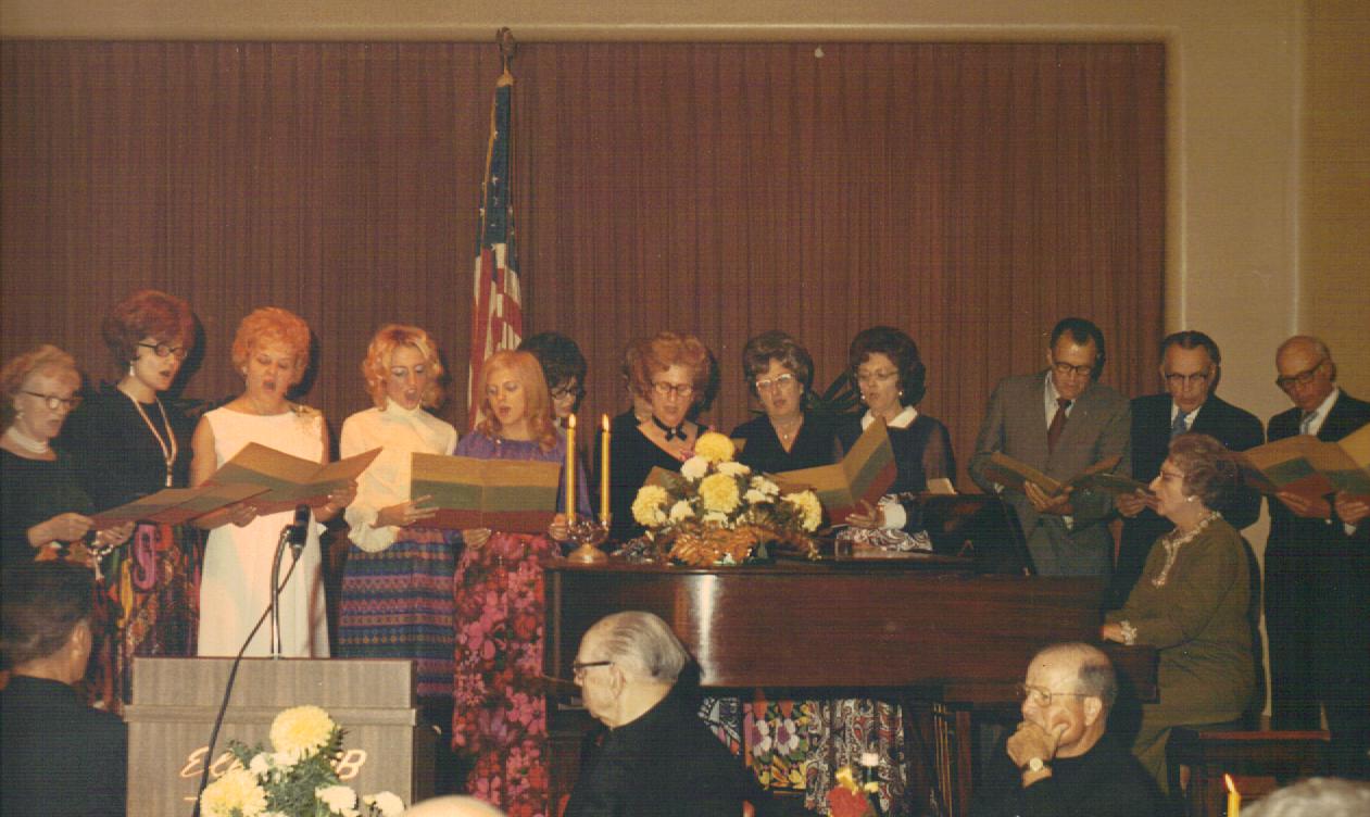 Members of the renowned church choir sing at the retirement party for long-time pastor the Rev. S.O. Yunker at the Springfield Elks Club Nov. 14, 1971. Left to right: unidentified person, Mary Ann Foster, Ann (Pazametsky) Traeger, unidentified person, Mary Ann Rackauskas, Bernice Kurila, Catherine (Gillette) Cooper, unidentified woman, Peter Urbanckas, Alfred Urbanckas, Charlie Foster, Walter Rodutskey (off right edge of the photo), Anne (Mosteika) Foster playing the piano.